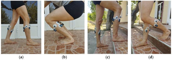 Leg movement exercises used in the experiment ((a)—walking, (b)—sitting and standing, (c)—up the stairs, (d)—down the stairs).