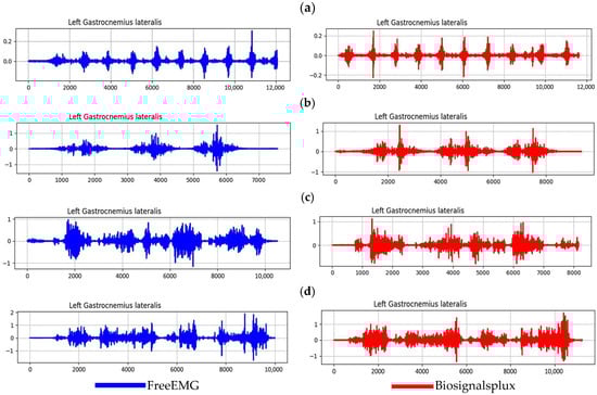 Visual representation of EMG signals obtained from the left gastrocnemius lateral muscle ((a)—walking, (b)—sitting and standing, (c)—up the stairs, (d)—down the stairs).