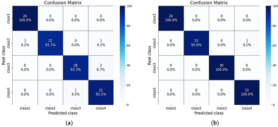 (a) Confusion matrix for FreeEMG, (b) confusion matrix for Biosignalsplux. class1—walking, class2—sitting and standing, class3—up the stairs, and class4—down the stairs.