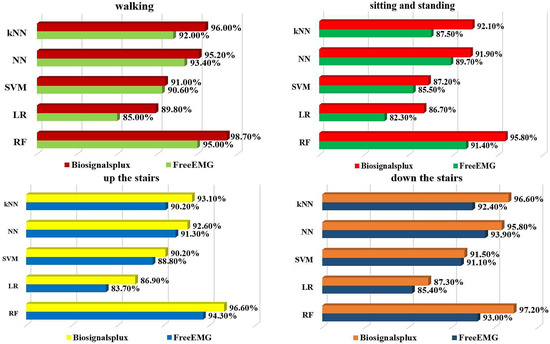 In addition, the NN and kNN algorithms also showed high accuracy results. For example, in the walking movement, the NN algorithm worked with 93.4% accuracy in FreeEMG and 95.2% in Biosignalsplux. The kNN algorithm has achieved the highest results in other studies for classifying EMG signals [31]. However, in our study, it performed worse than the RF and NN models. In the down the stairs movement, the kNN algorithm achieved 92.4% accuracy in FreeEMG and 96.6% in Biosignalsplux.