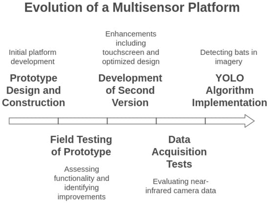 Figure 1 illustrates the methodology. The development process began with the design and construction of the first prototype of a multisensor platform [28]. This initial version was tested in the field to assess its functionality and identify areas for improvement. Based on these tests, a second version of the platform was developed with several key enhancements. We integrated a touchscreen interface to improve user interaction, repositioned the infrared light projectors above the cameras and fixed them to ensure consistent illumination, added a high-frequency sound recorder, and refined the overall design to improve portability for field deployment (see Figure 2 and Figure 3). Following these hardware improvements, a new series of data acquisition tests was conducted. For this study, we focused specifically on the data collected from the near-infrared cameras. Multiple versions of the YOLO (You Only Look Once) object detection algorithm were implemented to detect bats in the captured imagery. We then evaluated and compared the performance of each YOLO version in terms of detection efficiency.