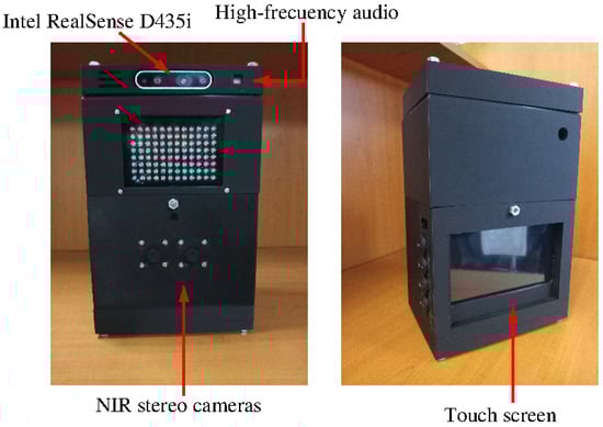 The left image shows a multisensor platform comprising two near-infrared (NIR) cameras, infrared projectors, an Intel RealSense D435i depth camera, and microphones capable of capturing audio with a Maximum Recordable Frequency of 128 kHz. The right image shows the multisensor platform, which includes a touchscreen interface that enables direct interaction with the device.
