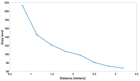 In this section, we evaluate the camera’s sensitivity in capturing bat imagery. Using the acquisition system described in Section 2.1, we recorded images at varying distances from the subject and computed the corresponding gray-level intensities. Conducting this experiment with a live bat posed practical challenges in controlling the conditions; therefore, we used a stuffed bat as a surrogate, placing it at different distances to assess the gray-level response. The results are presented in Figure 7.