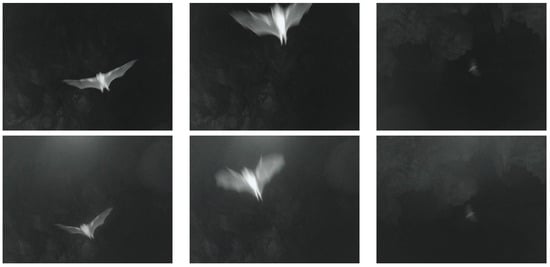 - Fujioka, E.; Fukushiro, M.; Ushio, K.; Kohyama, K.; Habe, H.; Hiryu, S. Three-Dimensional Trajectory Construction and Observation of Group Behavior of Wild Bats During Cave Emergence. J. Robot. Mechatronics 2021, 33, 556–563. [Google Scholar] [CrossRef]