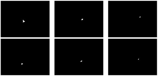 Figure 8 presents a sample image acquired by the stereo system deployed inside a cave. In contrast, Figure 9 illustrates the bat detection obtained through background subtraction (as described in Section 2.2), using the parameters and from Equations (3) and (4), respectively. A sequence of n frames before and after each detection was analyzed to manually label the bats. Figure 10 shows another detection sequence. It is common for bats to go undetected in several frames; therefore, adjacent frames were also reviewed and manually labeled. Conversely, false positives occasionally occurred, and those frames were manually discarded. These semi-automatically labeled images were used to train various versions of the YOLO model.