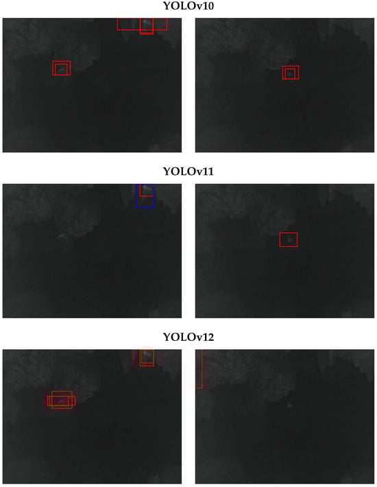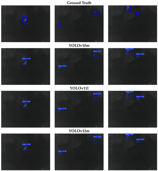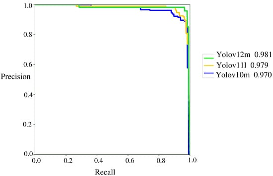 Figure 11 shows the precision–recall curves for the YOLOv10-m (blue), YOLOv11-l (yellow), and YOLOv12-m (green) models. All three models demonstrate outstanding performance, with areas under the curve (AUC-PR) exceeding 0.97. Specifically, YOLOv10-m achieves a maximum value of 0.970, while YOLOv11-l follows closely with 0.979, and YOLOv12-m slightly outperforms both with an AUC-PR of 0.981. These results highlight the model’s high detection capabilities and low false positive rates, validating its effectiveness for bat detection.