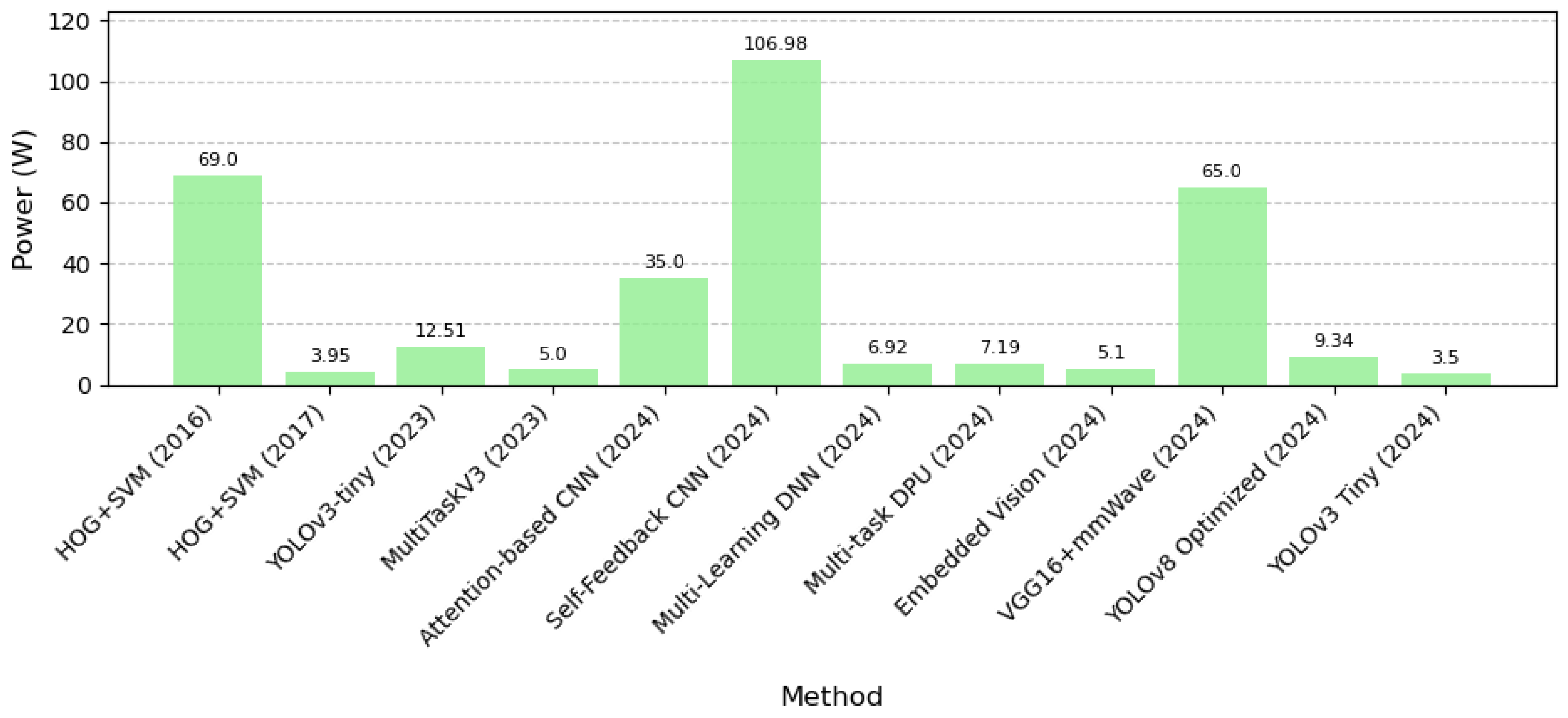 37]. The YOLOv3 Tiny implementation by Al Amin et al. (2024) operates at remarkably low 3.5 W [