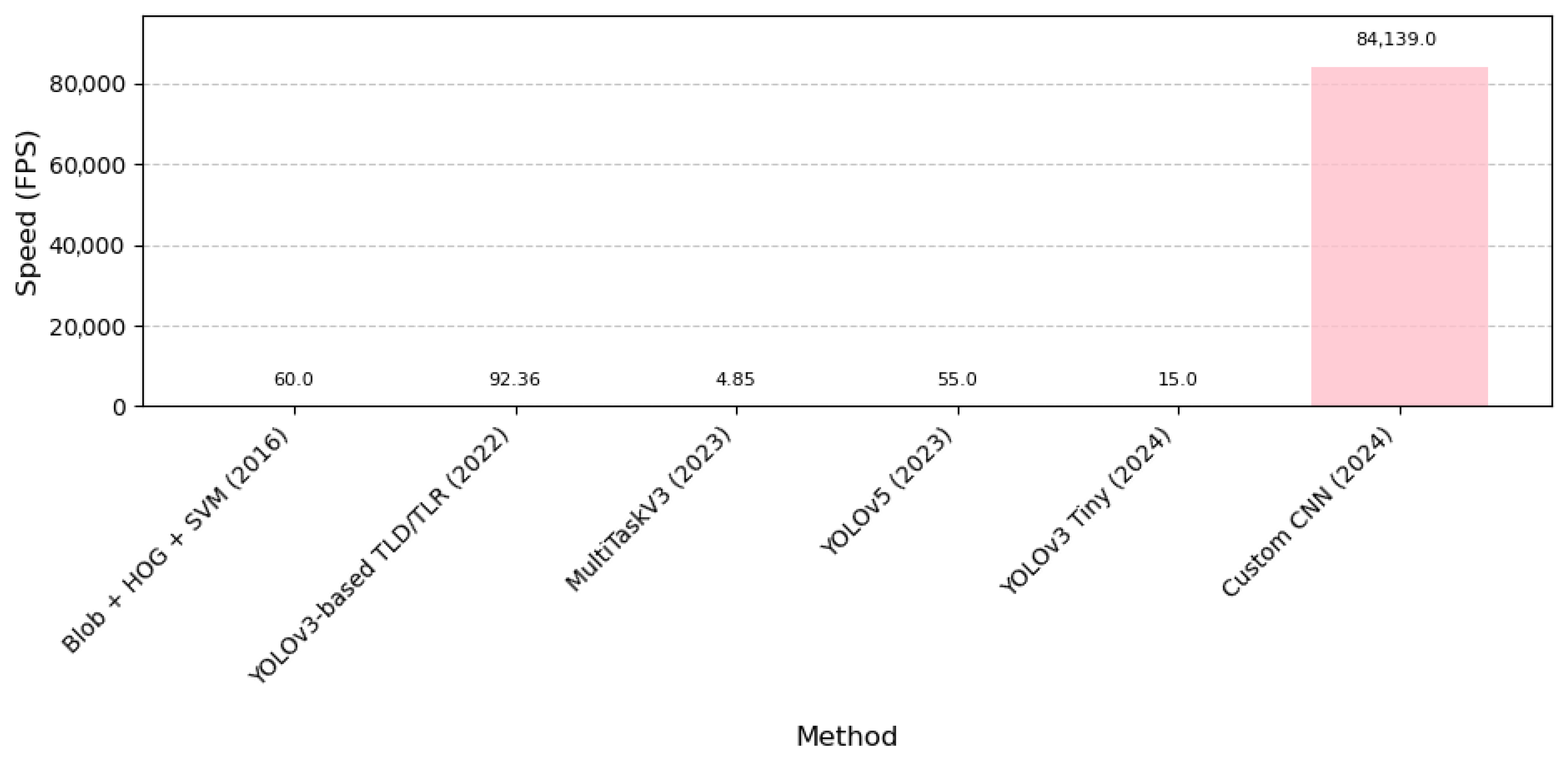 Figure 3 display a comprehensive visualization of FPGA-based vehicle and pedestrian-detection performance across different methodologies. The analysis reveals significant performance evolution from classical to modern approaches. Modern deep-learning implementations demonstrate remarkable performance improvements, with the SSD-MobileNet-V1 implementation by Anupreetham et al. (2023) achieving an exceptional 2167 FPS through highly efficient hardware acceleration and a fully pipelined architecture [
