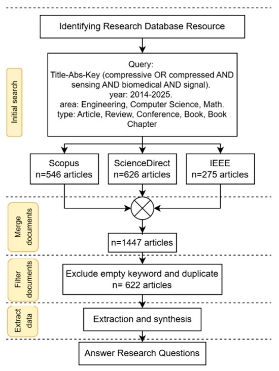 The subsequent stage involved paper searching, study selection, and data extraction from research databases, utilizing bibliometric analysis and adhering to the PRISMA protocol (Figure 2). Papers were searched across three prominent research databases: ScienceDirect, Scopus, and IEEE. The search query employed the keywords “Compressive Sensing Biomedical Signal” or “Compressed Sensing Biomedical Signal”. The study selection criteria included publications from 2014 to 2025, encompassing conferences, journals, books, review papers, and book chapters. The query is (title-abs-key (compressive and sensing and biomedical and signal) or title-abs-key (compressed and sensing and biomedical and signal)) and pubyear > 2013 and pubyear < 2026 and (limit-to (subjarea, “engi”) or limit-to (subjarea, “comp”) or limit-to (subjarea, “math”)) and (limit-to (doctype, “ar”) or limit-to (doctype, “cp”) or limit-to (doctype, “re”) or limit-to (doctype, “ch”) or limit-to (doctype, “cr”) or limit-to (doctype, “bk”)).