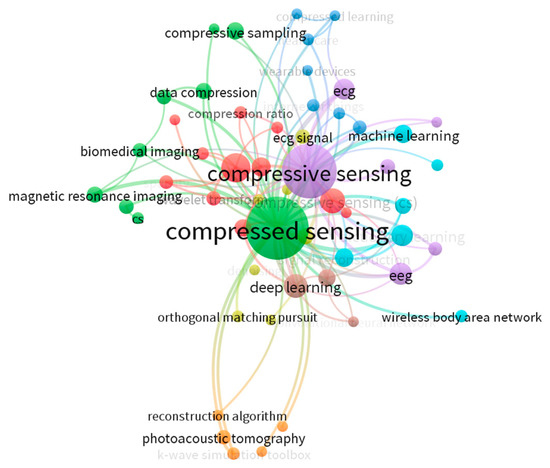 As observed in Figure 3, “compressed sensing” (and its variant “compressive sensing”) emerges as the central and most prominent keyword, with the highest number of occurrences (168) and a total link strength of 195, unequivocally confirming its centrality to our review topic. The following keywords were used in this analysis: compressive sensing, deep learning, ECG, EEG, compressed sensing (cs), dictionary learning, electrocardiogram, signal reconstruction, classification, and so on. The clustering revealed several key thematic areas that define the field’s current research fronts. For instance, the purple cluster prominently features ‘deep learning’, ‘machine learning’, and ‘EEG’, indicating a strong convergence of advanced computational techniques with neurophysiological signal processing. Similarly, the red and orange clusters highlight the significant application of compressive sensing in biomedical imaging, including ‘magnetic resonance imaging’ and ‘photoacoustic tomography’. Other notable themes include specific signal applications like ‘ECG’ (light blue cluster) and fundamental ‘reconstruction algorithms’ (orange/yellow cluster). The insights gained from this VOSviewer analysis were instrumental in refining our literature selection. By visualizing the connections and thematic clusters from thousands of initial search results, we were able to validate the core relevance of our research focus, identify the most active and central sub-fields, and efficiently filter the vast corpus of literature.