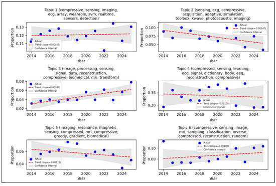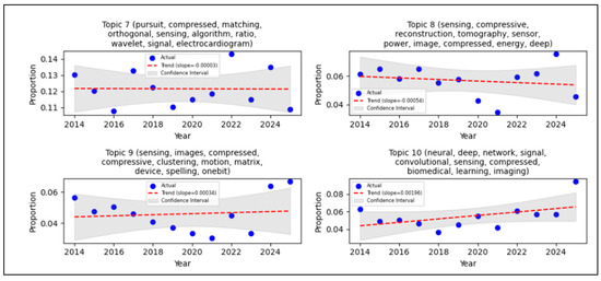 The Systematic Mapping Study (SMS) and Systematic Literature Review (SLR) conducted in this research emphasize the escalating importance of Compressive Sensing (CS) within biomedical signal processing, particularly concerning Wireless Body Sensor Networks (WBSN). A bibliometric analysis, performed using VOSviewer, revealed prominent research clusters formed around keywords such as “compressive sensing,” “deep learning,” and “ECG.” Notably, “compressed sensing” exhibited the highest occurrence (168) and a total link strength of 195, signifying a strong research emphasis on optimizing CS techniques for physiological signals, including ECG and EEG. Furthermore, trend analysis, visually represented through Structural Topic Modelling (STM) with Latent Dirichlet Allocation (LDA), showed a positive slope in topic prevalence. This indicates a consistent surge of interest in CS applications for biomedical signals throughout the 2014 to 2025 period. This observed trend highlights CS’s substantial potential to mitigate critical challenges in data compression, storage, and transmission. These are the principal factors for the development of energy-efficient and real-time healthcare monitoring systems. Figure 4 describes the STM with LDA result for topic 4 as the highest proportion of articles (approximately 35%) with author keyword combinations: compressed, sensing, learning, ECG, signal, dictionary, body, EEG, reconstruction, and compressive. Topic 9 showed the lowest proportion of articles whit stagnant trends from 2014 till 2025. Topic 3 showed the highest trend, whit a slope of 0.00287, but its proportion is still low. The negative slopes indicate that the proportion available for research or publication consequently decreases, these are topics 2, 4, 5, 7, and 8. Confidence interval estimates of the model’s confidence in the predicted trend, and topic 3 had a good confidence interval for this study. This means that the number of articles (with their author keywords) has consistently increased each year.