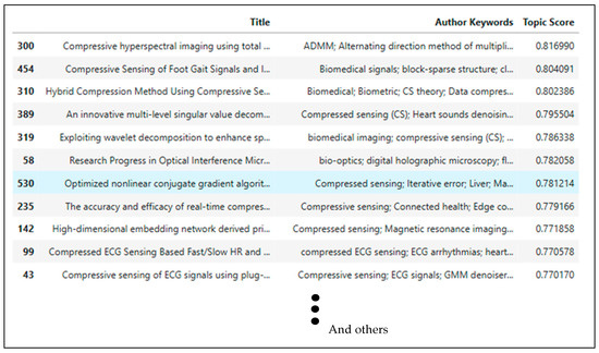 The more detailed analysis of Table 2 is presented in Section 4. This system provides a relevance score for article and paper titles based on a selected topic. An example of a topic search and the resulting scores are shown in Figure 5. Based on these recommended articles, titles were located within the dataset. Subsequently, the DOI or a direct link to the reference source can be retrieved to facilitate the downloading of the papers intended for Systematic Literature Review (SLR).