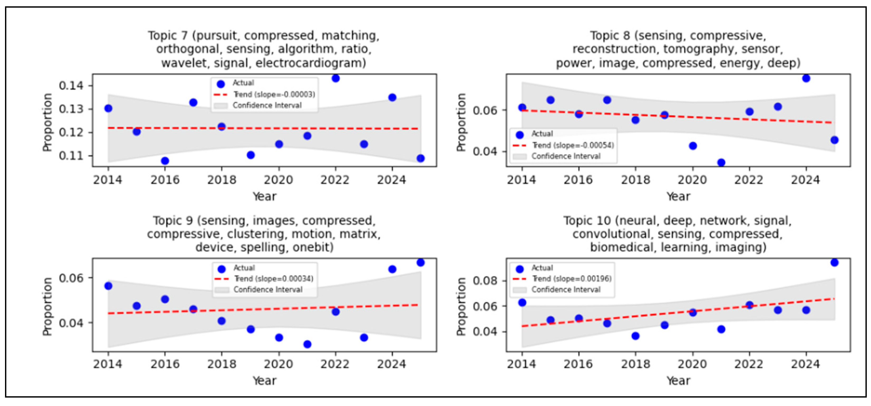 4 | compressed, sensing, learning, ECG, signal, dictionary, body, EEG, reconstruction, compressive | ~34.0% | −0.00120 | ~(0.300–0.370) | Stagnant |