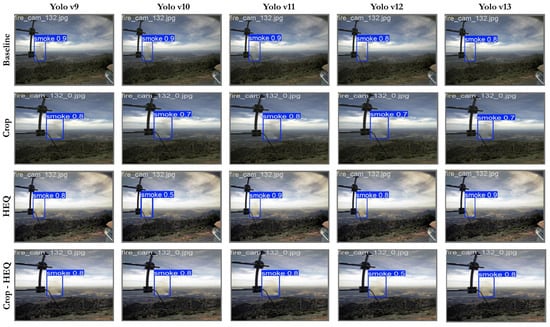 Interestingly, the combination of Cropping and HEQ (Crop + HEQ) does not lead to additive benefits. In most cases, performance degrades, with precision and recall dropping sharply, especially for YOLOv9 and YOLOv12. This may be due to an over-aggressive pre-processing pipeline where contrast normalization and spatial Cropping together reduce both image context and smoke texture, making detection harder. YOLOv10 and YOLOv13 show slight stability in their scores under this condition, but not surpassing the best results obtained with HEQ alone.