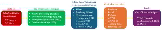 Recently synthesized wildfire smoke advancements have used convolutional and Transformer-inspired deep learning designs. Earlier systems detected smoke via computer vision and augmented reality techniques []. Techniques loosely based on the CNN architecture, i.e., enhanced YOLOv4, provided significant improvements over their precursors, and quantifiable improvements in smoke detection performance were imparted []. Additionally, the lightweight versions of YOLO have gained ground in real-time wildfire detection. Alkhammash et al. [] compared YOLOv9-tiny and YOLOv10-nano to YOLOv11-nano on wildfire detection tasks and found that the latter outscored the former (precision 0.845, mAP50 0.859). Li et al. [] also built upon YOLOv11, adding a multi-scale convolutional attention (MSCA) module to enhance smoke detection. Liu et al. [] introduced the single-shot multiBox detector (SSD), an efficient and effective single-stage object detector that regresses the bounding-boxes and the class-probabilities on the multi-scale feature-maps and default-boxes; they evaluated the technique with the dataset given in []. Wang et al. [] proposed the Transformer-based cross contrast patch embedding (CCPE) with a modified Swin Transformer that deals with low-level feature mobilization in smoke identification and tested it on the novel RealFire benchmark. EFA-YOLO [] is a lightweight attention-enhanced YOLO model that also claims ultra-efficient detection and is thus fit to be deployed on the edges. These studies are an indication of the usefulness of architecture improvements and domain-aware pre-processing, but none of them evaluated multi-step pre-processing methods (e.g., HEQ, Cropping) or YOLOv13-nano. These are gaps that our study partially (the former) and, in parts, fully (the latter) fills. Moreover, in [], the authors experimented with YOLOv9-tiny on a larger dataset that contained the one that our research used, without using the five-fold cross validation method. They achieved a mAP50 of 0.885 in a multimodal dataset containing 2321 images.