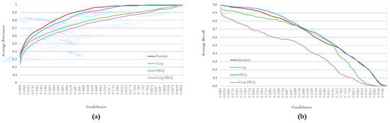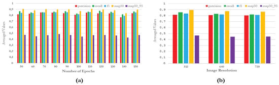 Next, we provide a sensitivity analysis of the investigated approach considering the deployment of YOLOv13-nano with the combination of Crop-HEQ pre-processing techniques and examine its behavior on different epoch variations and different image resolutions, as illustrated in Figure 16 which depicts the Precision, Recall, F1-score, mAP50, and mAP50_95 metrics averaged over the five-folds. In the plots depicted in Figure 16a,b, the y-axis corresponds to the averaged values of these metrics and the x-axis corresponds to the number of epochs (a) and the different image resolutions (b).