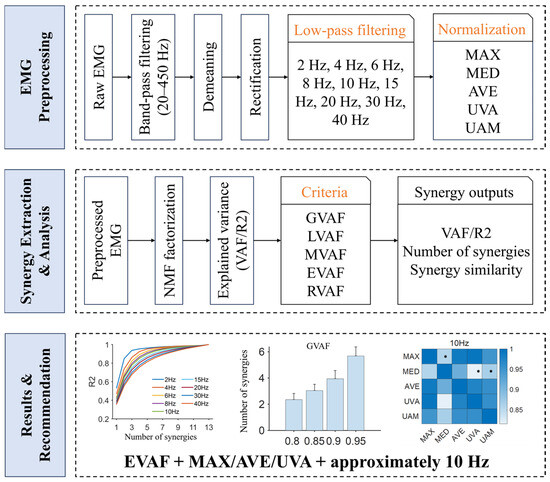 Muscle synergy, describing modular control strategies of the CNS, has clinical promise. However, the interactive effects of EMG preprocessing on synergy analysis remain underexplored [13,14]. Prior studies typically examined isolated elements (e.g., algorithm choice with fixed preprocessing [33]; limited filter settings or NMF initialization techniques without a broad normalization/criteria [17,41]; scoping reviews without experimental tests of parameter interactions [42]). In contrast, we systematically evaluated three preprocessing domains simultaneously, including nine cut-off frequencies, five normalization methods, and five synergy extraction criteria, covering 225 unique settings across 135 participants. By coupling this large-scale design with a synergy similarity and threshold sensitivity analysis, we reveal interaction effects and identify a robust default (EVAF + MAX/AVE/UVA with a moderately high cut-off approximately 10 Hz). These results provide a data-driven roadmap that improves cross-laboratory comparability, helps isolate disease-related changes in synergy structure from processing artifacts, and supports the translation of synergy analysis from laboratory research to clinical application.