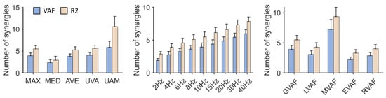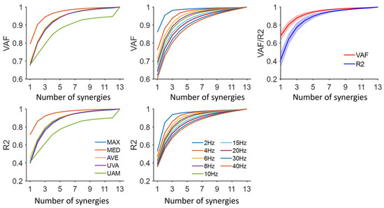 Higher cut-off frequencies consistently resulted in smaller VAF/R2 values (Figure 2). Post hoc analysis confirmed that this difference was statistically significant (p < 0.05). However, no significant differences in R2 were observed under the conditions of UAM and low cut-off frequencies (below 10 Hz) (p > 0.05). When the same number of synergies was extracted (default: MAX, 10 Hz), the VAF values were significantly higher than those of R2 (p < 0.001).