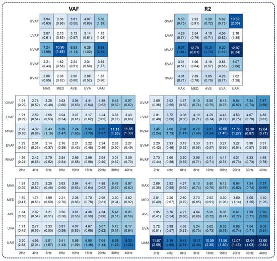 Both normalization methods and cut-off frequencies exhibited a significant influence on the explained variance (p < 0.001). The effect of normalization methods on VAF and R2 was consistent across the analysis (Figure 2). MED had the highest value, and UAM yielded the smallest. The VAF/R2 curves for MAX, AVE, and UVA were closely aligned. Post hoc analysis revealed no significant difference in VAF values between MAX and AVE (p > 0.05). Additionally, within the 4–8 Hz cut-off frequency, no statistical difference in VAF values was observed between MAX and UVA (p > 0.05). At a low cut-off frequency of 2 Hz, no significant differences in VAF values were detected across MAX, MED, and AVE (p > 0.05). For R2, significant differences were observed among all five normalization methods. However, under the 4–6 Hz cut-off frequency, R2 values between MAX and UVA were comparable (p > 0.05).