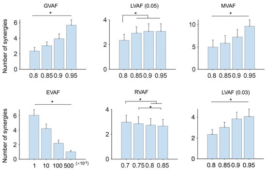 In this analysis, thresholds for each criterion were pre-specified following common practice to ensure cross-study comparability. The results showed that the number of synergies varied with the predefined thresholds of each criterion (Figure 6). Specifically, for GVAF, MVAF, and EVAF, the number of synergies was significantly influenced by the threshold (p < 0.05). For LVAF, which requires two predefined parameters, the number of synergies increased as the first threshold was raised (tested at 0.8, 0.85, 0.9, and 0.95) while the second threshold was fixed at 0.05 (Figure 6, LVAF (0.05)). However, no significant differences were observed for thresholds above 0.8. When the second threshold was set to 0.03 (Figure 6, LVAF (0.03)), the number of synergies increased significantly with higher values of the first threshold (p < 0.05). For RVAF, significant differences (p < 0.05) were observed between thresholds of 0.7 and 0.8, 0.7 and 0.85, and 0.75 and 0.85.