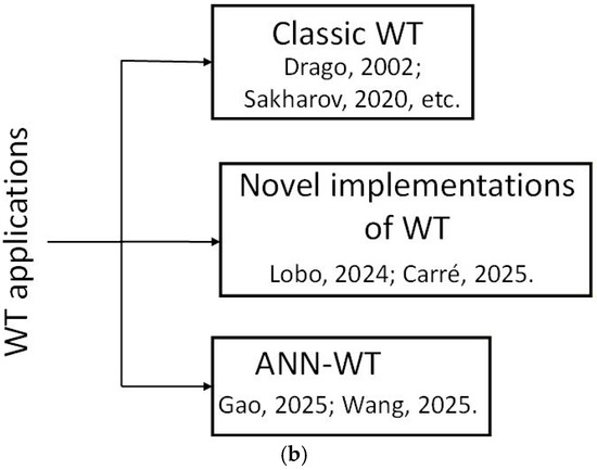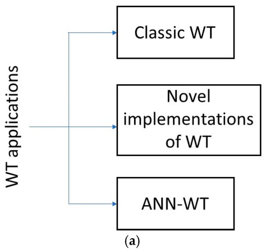 Proposed taxonomy: (a) ideal categorization, and (b) categorization of references from Section 2: classic WT [9,10,11,13], novel implementations [15,16], ANN+WT [12,17].