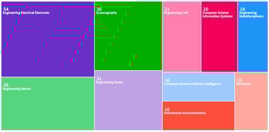 Figure 4 shows the distribution of publications. Notably, it is stable. It should be noted that 2026 is not included because it is currently 2025. Further, in 2026, there is only one web-first publication. Figure 5 shows the WoSCC categories of the papers: 38 papers are from “Engineering, Marine” and 31 from “Engineering, Ocean”, which could be relevant for our research, but there may also be relevant papers in other categories.