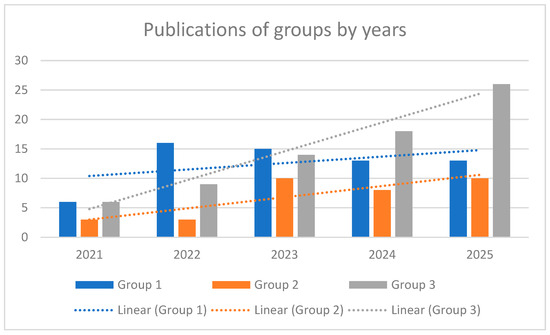 It can be seen that this shift resulted in a change in group representation. Notably, the most prominent is now the third group, which includes ANNs. This group accounts for 43% of the remaining papers.
