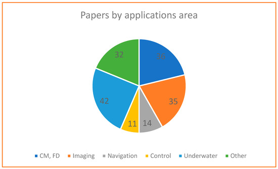 The largest group is underwater applications, such as underwater imaging, whether sonar- or optical-based. It included 42 of 170 papers. The second group is primarily marine engineering applications, such as condition monitoring, fault detection, and damage detection, which are related. This group includes 36 of the 170 papers. The next group covers imaging (optical, infrared, or radar) and consists of 35 papers. Motion prediction and navigation applications are addressed in 14 papers, and control tasks are addressed in 11 papers.
