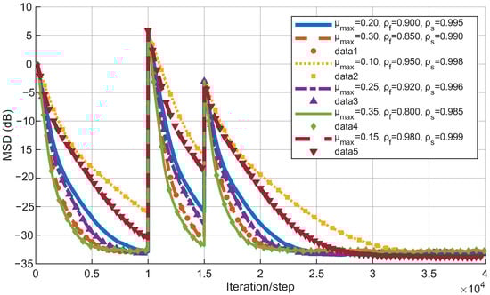 The convergence behavior of the VSS-NSAF algorithm is primarily influenced by three key parameters: the maximum step size , , and . To investigate this, several parameter configurations are tested in the experiment to analyze the convergence rate and steady-state error of the algorithm under varying conditions. This analysis aims to assess how parameter tuning affects the algorithm’s stability and adaptive performance in the time domain. The normalized mean square deviation (NMSD) curves corresponding to different parameter settings, as well as sensitivity plots illustrating the influence of these parameters on performance metrics and step size among the total process, are presented in Figure 1, Figure 2 and Figure 3.