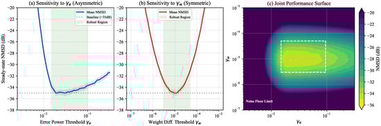 - Joint Robustness (Figure 6c): The joint contour plot identifies a broad “Operating Zone” (marked by the dashed rectangle). Within this region, the proposed VSS-NSAF consistently achieves the target NMSD of approximately −35 dB, proving that precise fine-tuning is not required for practical applications.
