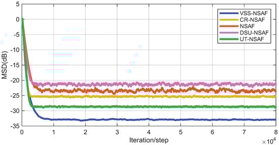 As illustrated in Figure 4 and Figure 5, the VSS-NSAF algorithm exhibits a clear convergence trend under all parameter configurations, with the mean square deviation (MSD) consistently decreasing, indicating effective adaptation to the initial stationary signal. During two successive abrupt signal changes, the green solid line () and the purple dashed line () exhibit faster descent rates, demonstrating an advantage in convergence speed. This suggests that a broader step-size selection range enables the algorithm to converge more rapidly to new signal states. Ultimately, all configurations stabilize at an NMSD level below , confirming that the algorithm successfully adapts to varying signal characteristics.