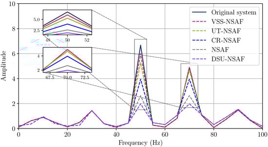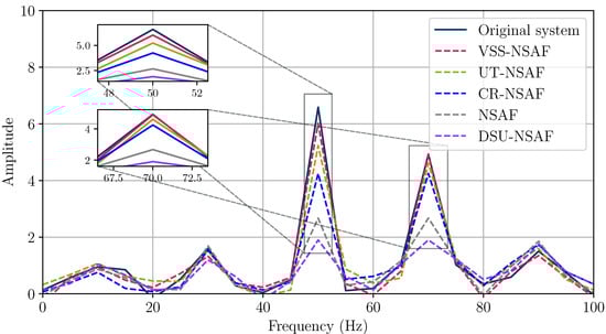 The spectral analysis results shown in Figure 9 and Figure 10 clearly demonstrate that the proposed VSS-NSAF algorithm delivers outstanding filtering performance under both 40 dB and 20 dB noise conditions. Compared to the baseline algorithms (NSAF, CR-NSAF, UT-NSAF, and DSU-NSAF), VSS-NSAF more accurately preserves the dominant oscillatory components in the frequency domain—especially around 50 Hz and 70 Hz—while effectively suppressing noise-induced spectral distortions.