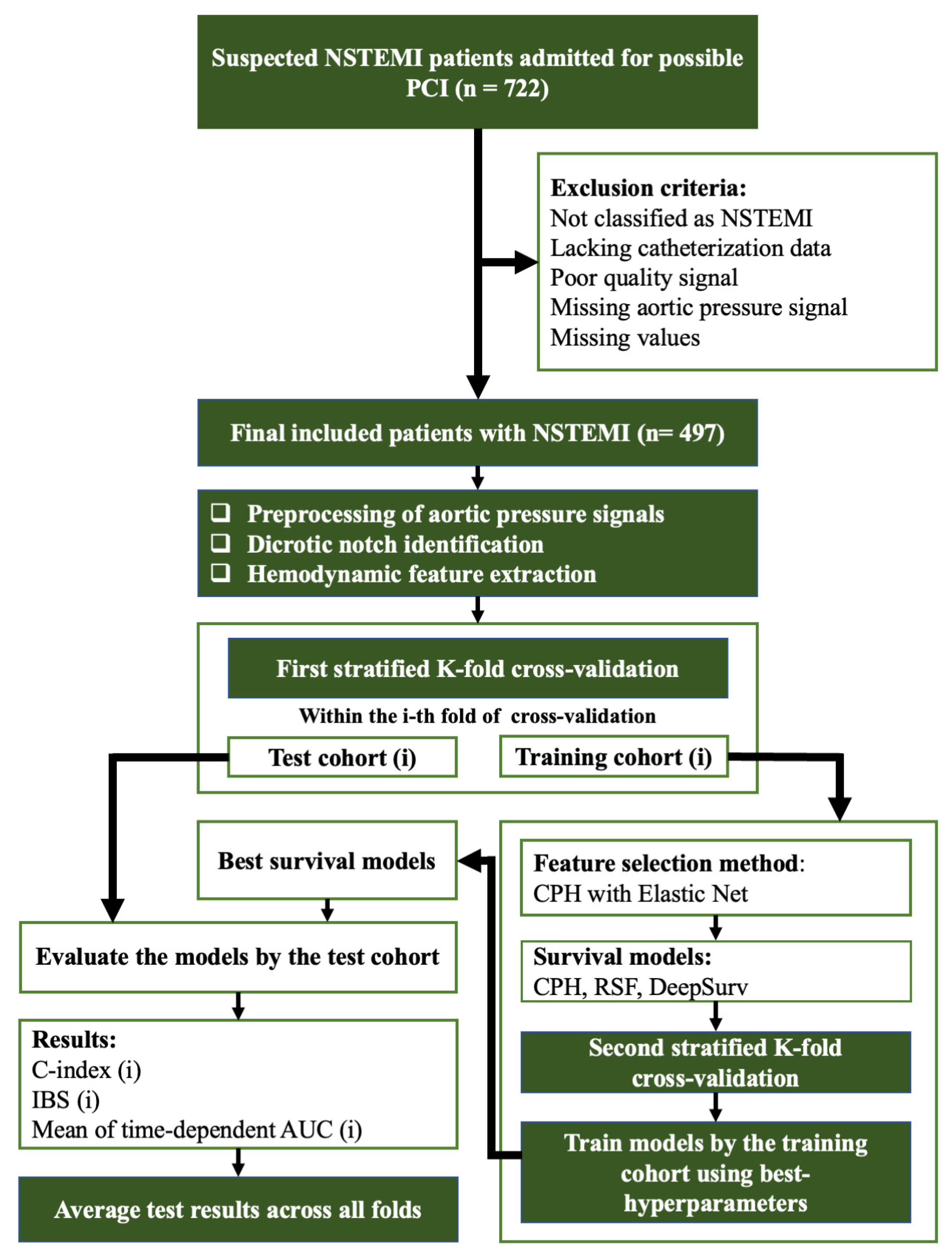 | Fractal dimension of p (FDp) Skewness of p (SK) Kurtosis of p (KU) Spectral entropy of p (SE) Average spectral power of p (Pave) Maximum spectral power (MSP) Maximum spectral power frequency (MSPF) Shock index (SI) Age shock index (SI_age) Modified shock index (mSI) Age-modified shock index (mSI_age) | Other than pressures, slopes, durations, and areas, we extracted additional features that we suspected might be important for identifying NSTEMI patients at risk of mortality. The FDp is the fractal dimension of each AP waveform. In time-series analysis, fractal dimension provides a measure of how complex or irregular a waveform is [59]. Skewness (SK) quantifies the asymmetry of the waveform, while kurtosis (KU) assesses whether the waveform has heavier or lighter tails compared to a normal distribution. We used these features to identify potential patterns that may help in detecting high-risk NSTEMI patients SE, Pave, MSP, and MSPF were the only features extracted from the frequency domain to assess whether they carried information relevant to mortality prediction. For example, SE measures the irregularity or complexity of a signal in the frequency domain, while Pave indicates the mean energy of the signal. MSP and MSPF represent the dominant spectral peak and its corresponding frequency, respectively. SI is defined as heart rate divided by systolic blood pressure. It was first introduced as an additional tool for evaluating hemodynamic stability of patients [60]. Since then, it has been widely used for risk stratification; for example, it has been applied to predict short-term adverse outcomes in STEMI patients [61] and to predict in-hospital mortality in NSTEMI patients [62]. The modified shock index (mSI) is defined as the ratio of heart rate to mean arterial pressure. SI_age and mSI_age are like SI and mSI but are calculated by multiplying SI and mSI by age. A study demonstrated that SI_age and mSI_age are even better predictors than SI and mSI for in-hospital cardiovascular events, as well as 6-month and long-term all-cause mortality, in a STEMI cohort [45]. |