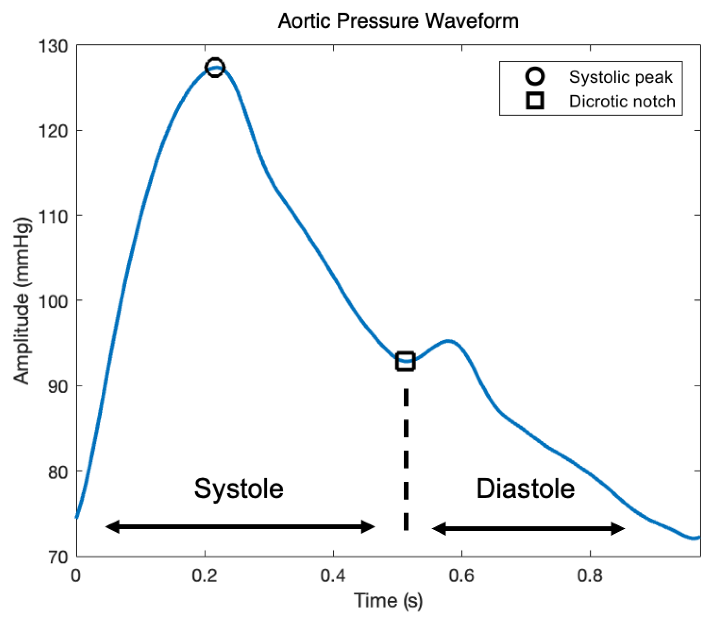 | Diastolic blood pressure (DBP) Systolic blood pressure (SBP) Mean aortic pressure (MAP) Dicrotic notch pressure (DNP) | SBP, DBP, MAP, and DNP were extracted to capture important components of the AP waveform. SBP represents the maximum of the AP waveform, while DBP represents the minimum pressure just before the next contraction. Both SBP and DBP have been shown to independently influence the risk of adverse cardiovascular events [50]. MAP represents the average pressure in a person’s arteries during one cardiac cycle. We used the commonly used definition of MAP as (2 × DBP + SBP)/3. It has been shown that in patients with cardiogenic shock treated with inotropic therapy, lower MAP is associated with worse clinical outcomes [51]. DNP is the pressure at dicrotic notch (see Figure A1). A higher DNP indicates effective closure of the aortic valve [52]. In addition, we calculated this value to extract other features, such as DesP (described below). |