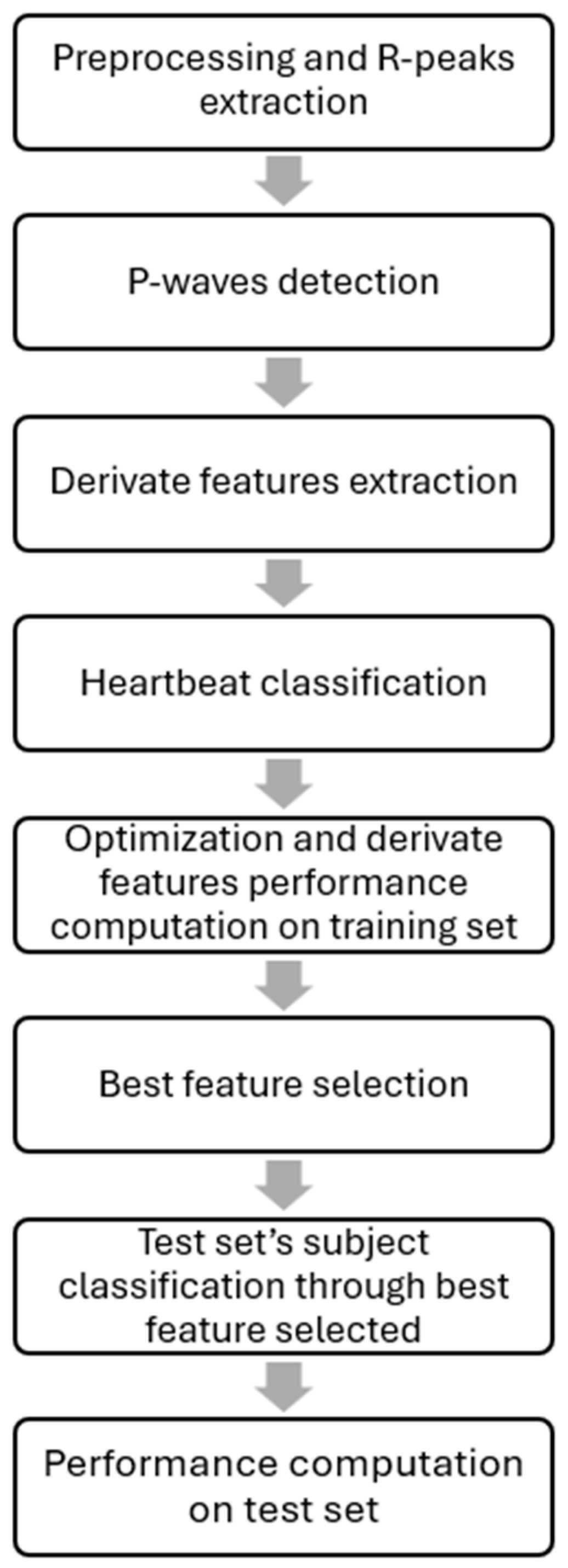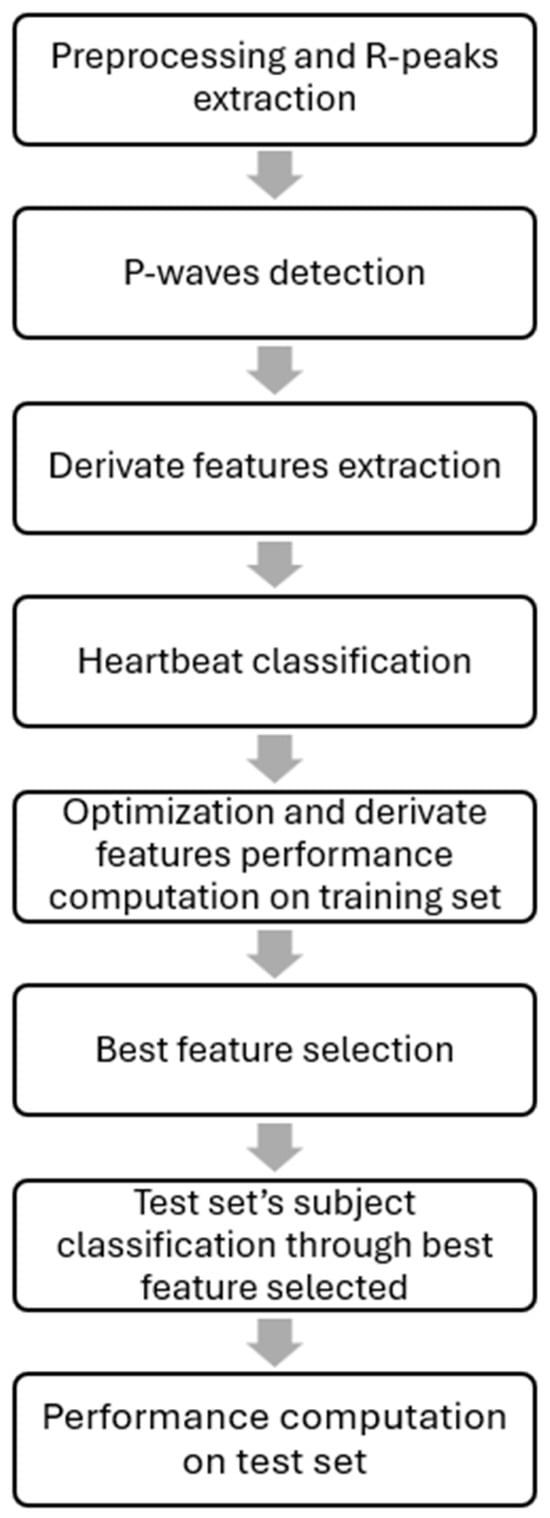 22]. Therefore, a deterministic automatic discrimination algorithm is proposed, as it does not require training on large datasets and the extraction of many features, unlike AI approaches, and could thus be a viable alternative for application in contexts characterized by limited data availability or in clinical settings. For this reason, only the P wave was considered, as the primary characteristic of the pathology lies in malformations of this specific wave. Although variations in RR intervals can also indicate the presence of atrial fibrillation, such changes are not exclusive to AF and are commonly observed in other types of arrhythmias [