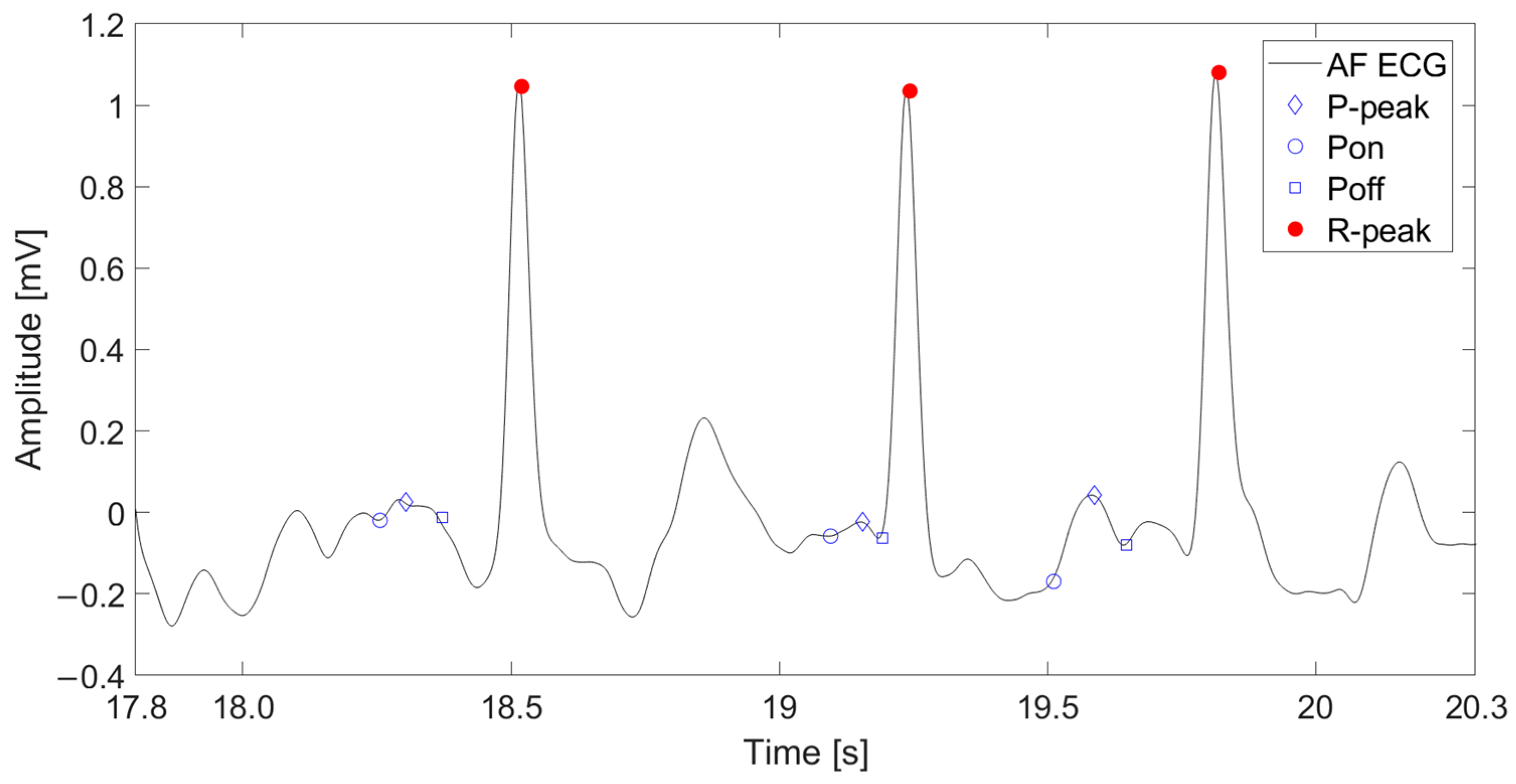 27]. However, this study only highlights the observation that patients with atrial fibrillation exhibit a higher RR interval standard deviation and a lower P power value—a parameter used to quantify the presence of the P wave—compared to healthy individuals. Notably, the algorithm does not perform beat-level detection, nor does it distinguish between healthy subjects and those affected by AF, unlike our proposed method. Another study utilized signal-averaged ECG recordings of the P wave in 73 patients following successful cardioversion. It calculated the duration of the filtered P wave and the root mean square (RMS) voltage of the final 20 ms of the P wave. The reported sensitivity and specificity for detecting AF recurrence post-cardioversion were 70% and 76%, respectively [