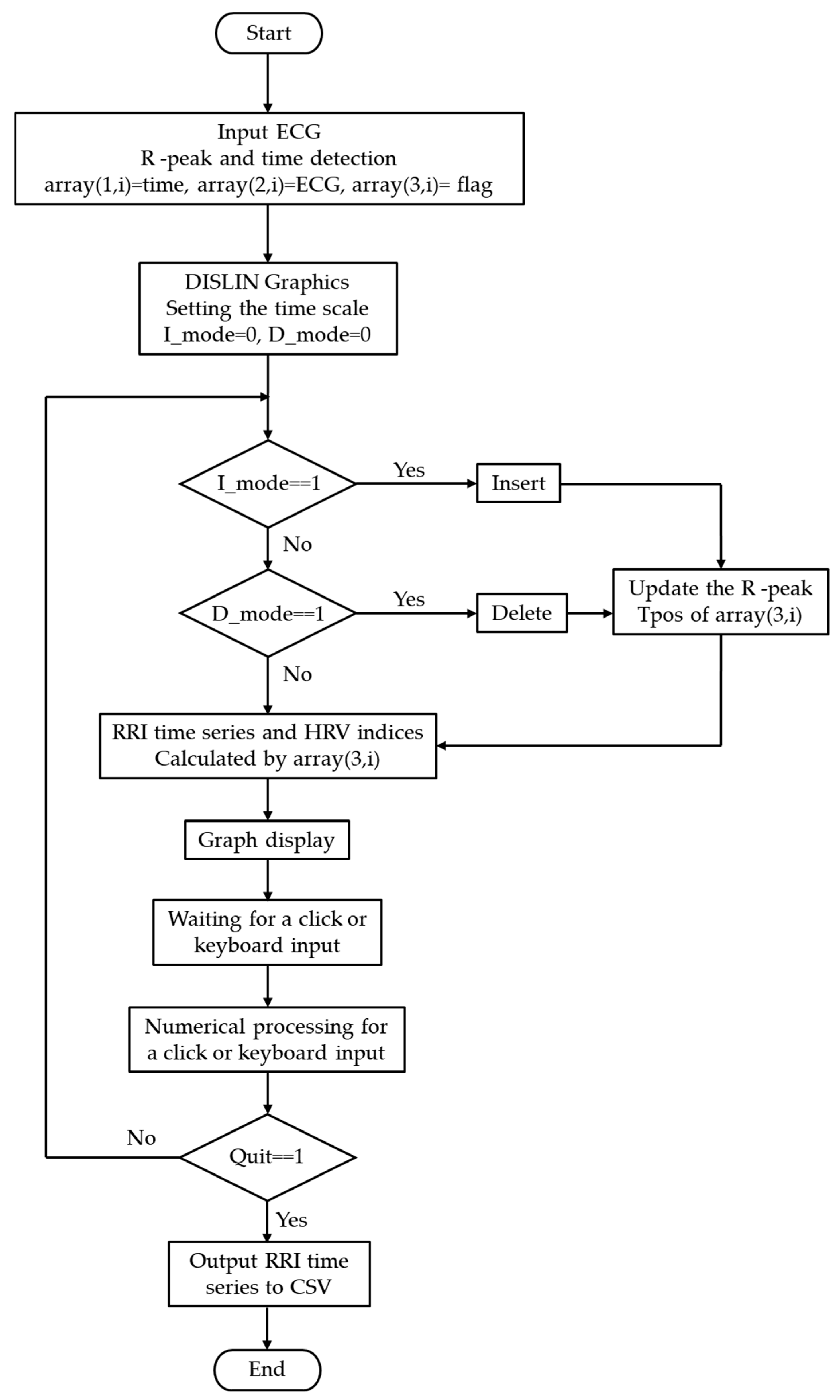 Taken together, the findings substantiate the robustness and practicality of the proposed algorithm for use across a wide range of ECG conditions. A key feature of the proposed algorithm is its simplicity: by maintaining a dedicated flag array that records the positions of detected peaks, the system enables recalculation of the RRI time series whenever peaks are added or removed, without altering the raw ECG data. This non-destructive structure ensures that only the flag values need to be updated, which greatly reduces computational cost and allows rapid updating of the RRI and associated analyses. The implementation of the system in Fortran is also an important strength in terms of processing speed. Fortran is a compiled language specialized for numerical computation, providing faster execution compared with interpreted languages such as Python or MATLAB. It is widely used in fields such as fluid dynamics, high-speed mathematical model development, and aerospace engineering [