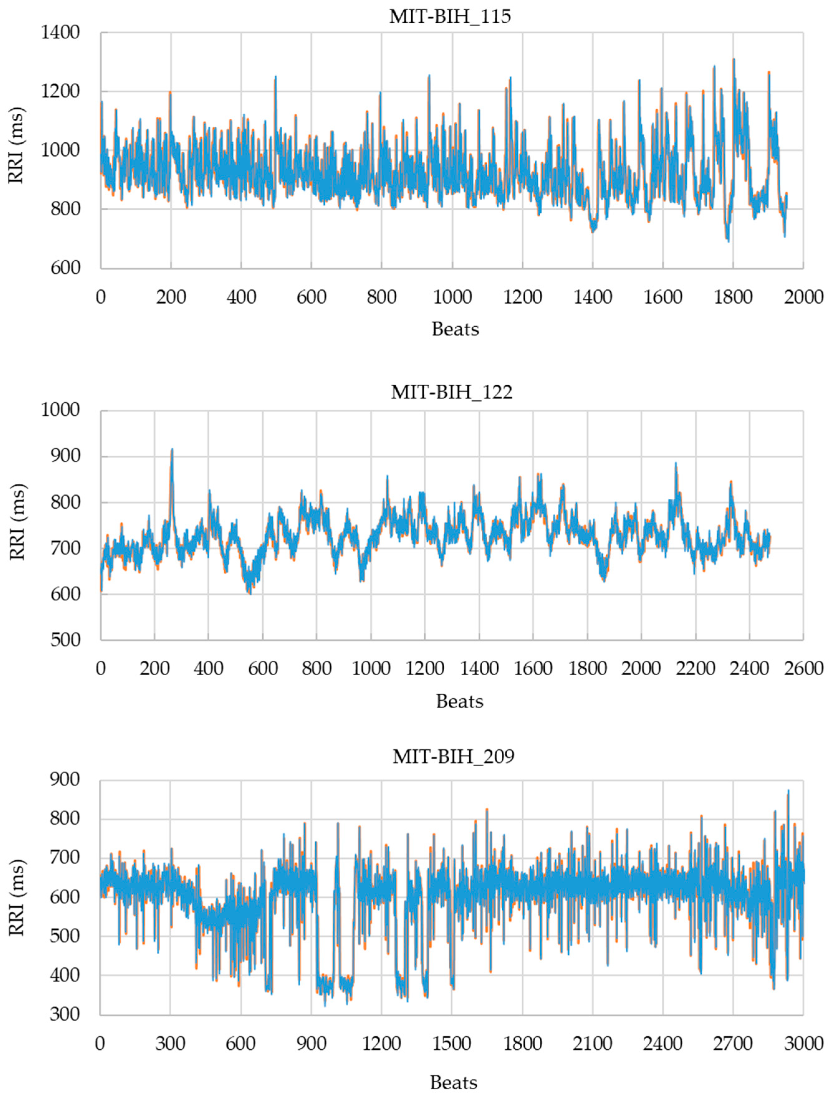 Record 115 corresponds to a 39-year-old female participant and includes 1953 R-peaks and 1952 RRIs, with heart rates of 50–84 bpm. Record 122 corresponds to a 51-year-old male participant and contains 2476 R-peaks and 2475 RRIs, with heart rates of 67–97 bpm. Record 209 corresponds to a 62-year-old male participant and exhibits mixed normal and supraventricular ectopic activity, consisting of 2621 normal beats, 383 atrial premature contractions (APCs), and 1 premature ventricular contraction (PVC), for a total of 3005 R-peaks and 3004 RRIs. Heart rates ranged 82–116 bpm during normal rhythm and 106–171 bpm during Supraventricular tachyarrhythmia (SVTA) episodes. For all three records, the R-peak timestamps provided in the annotation files (.atr) were used as the gold standard for accuracy evaluation.
