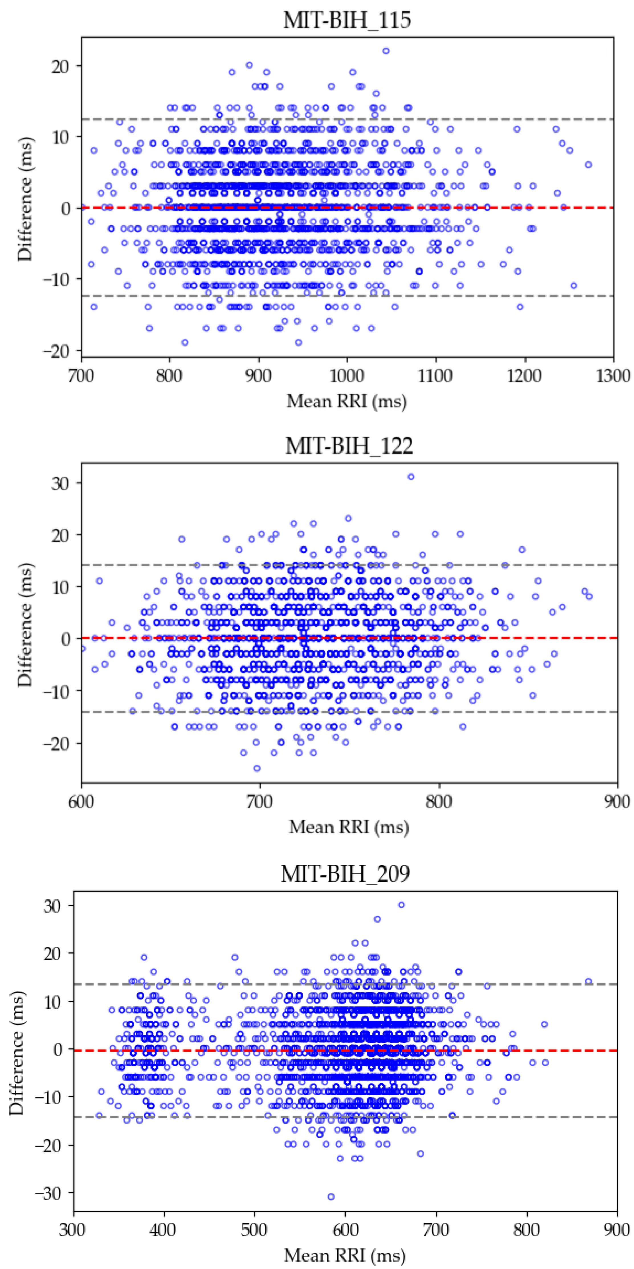 Figure 6). Across the three representative records (115, 122, and 209), the mean differences in RRI (GUI − Gold) were extremely small (−0.48 to −0.02 ms), indicating the absence of systematic bias in the resulting RRI measurements. The LOAs were approximately ±12 to ±14 ms, which corresponds to, at most, about ±5 samples when considering the sampling frequency of 360 Hz (2.78 ms per sample). This level of discrepancy falls within the expected range of human visual point-selection variability and is unlikely to affect subsequent HRV analysis. In all records, the differences were symmetrically distributed around 0 ms, indicating no tendency for the operator to consistently click on either the left or right side of the R-wave peak. Moreover, no RRI-dependent increase in error magnitude was observed, suggesting that the majority of residual discrepancies consisted of random rather than systematic errors. Notably, this level of accuracy was achieved even under the most challenging display condition with a 10 s time scale. Therefore, even higher accuracy can be expected in typical operational settings using finer time scales (e.g., 2–5 s per screen). In record 209, the differences formed a bimodal distribution; however, this was not attributable to the GUI itself but rather to the physiological characteristics of the recording, which included two distinct phases: sinus rhythm and APCs. Because APCs are associated with shorter RRIs, the formation of a separate cluster at lower mean RRI values is physiologically natural. Importantly, even during the APC-dominant phase, the differences (GUI − Gold) remained symmetrically distributed around zero, indicating no systematic bias in click positioning. These findings demonstrate that the accuracy of GUI-based R-wave correction is preserved even in the presence of arrhythmic events such as APCs and that performance does not degrade due to rhythm irregularity. Consequently, the proposed GUI tool can be considered robust not only for sinus rhythm data but also for real-world ECG recordings that include arrhythmias. As discussed above, the present study focused on validating the core correction framework using controlled ECG data, and extending the evaluation to noisier signals (e.g., wearable or ambulatory recordings) and multi-lead ECG data remains an important topic for future work.
