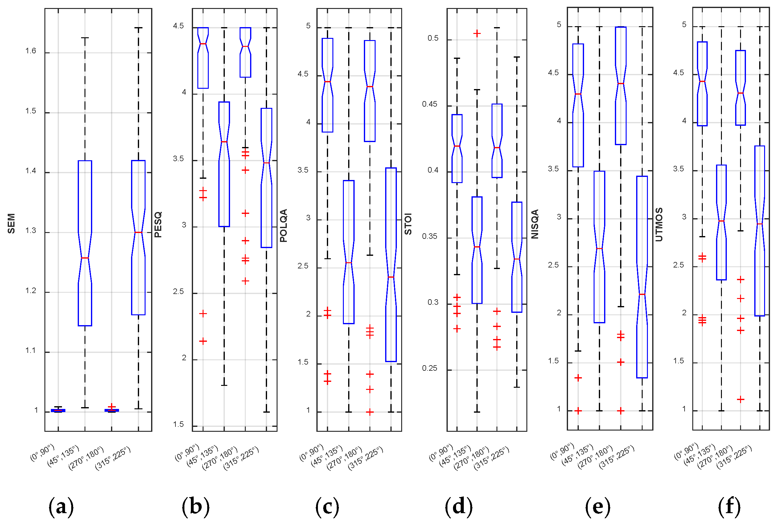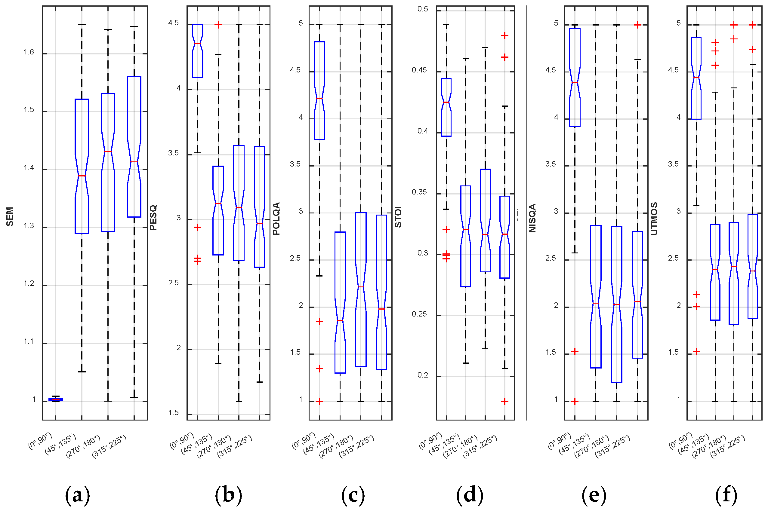 remains close to unity (around 1.00–1.05) in both angular pairs, with narrower boxes and fewer extreme outliers. PESQ, STOI, and UTMOS show high medians, reflecting better quality/intelligibility. At (45°, 135°), and (315°, 225°),