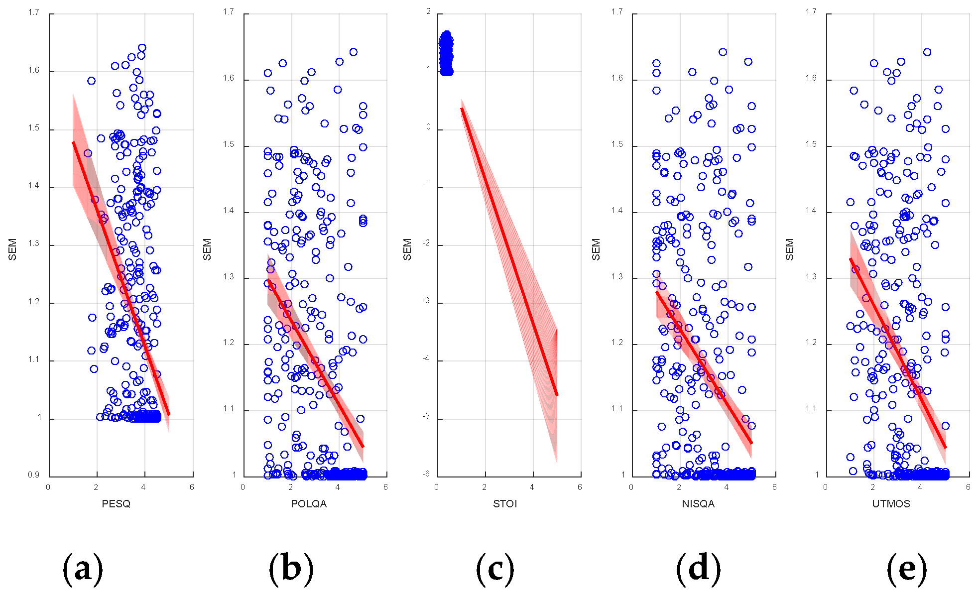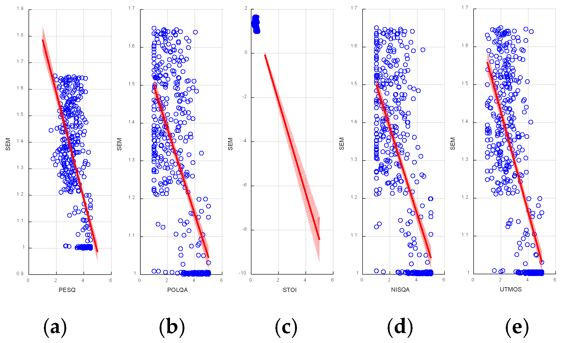 -UTMOS relationship is −0.585, following the same moderate-to-strong inverse trend observed in the Pearson analysis. This consistency between