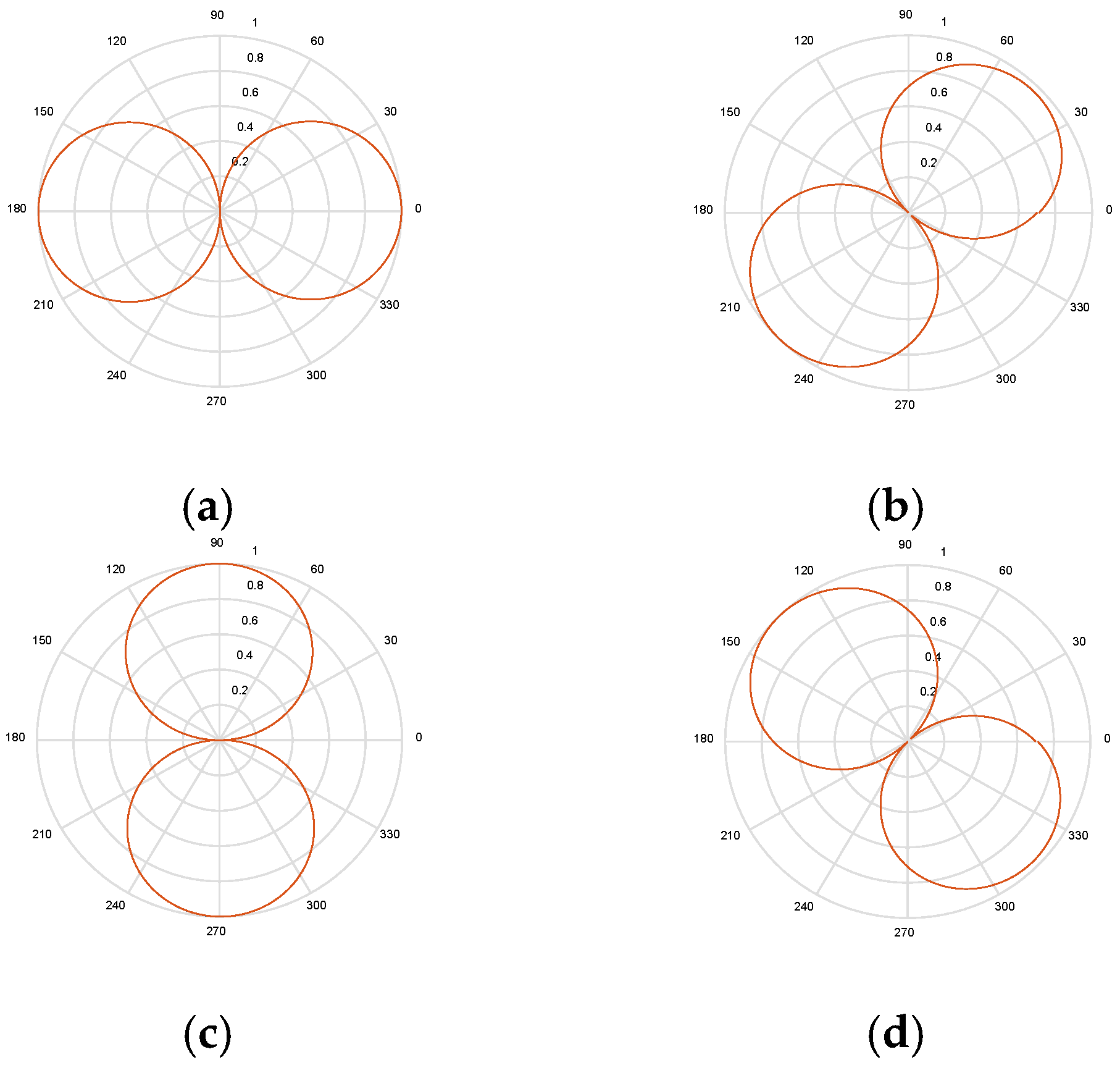 The directional pattern of the steerable-beam first-order DMA and its main-lobe beam orientation for the four azimuth and null angle pairs is shown in