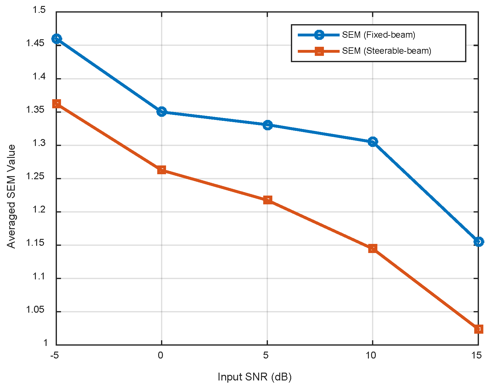 of approximately 1.5 and 1.35, respectively, while at 15 dB, the mean of the