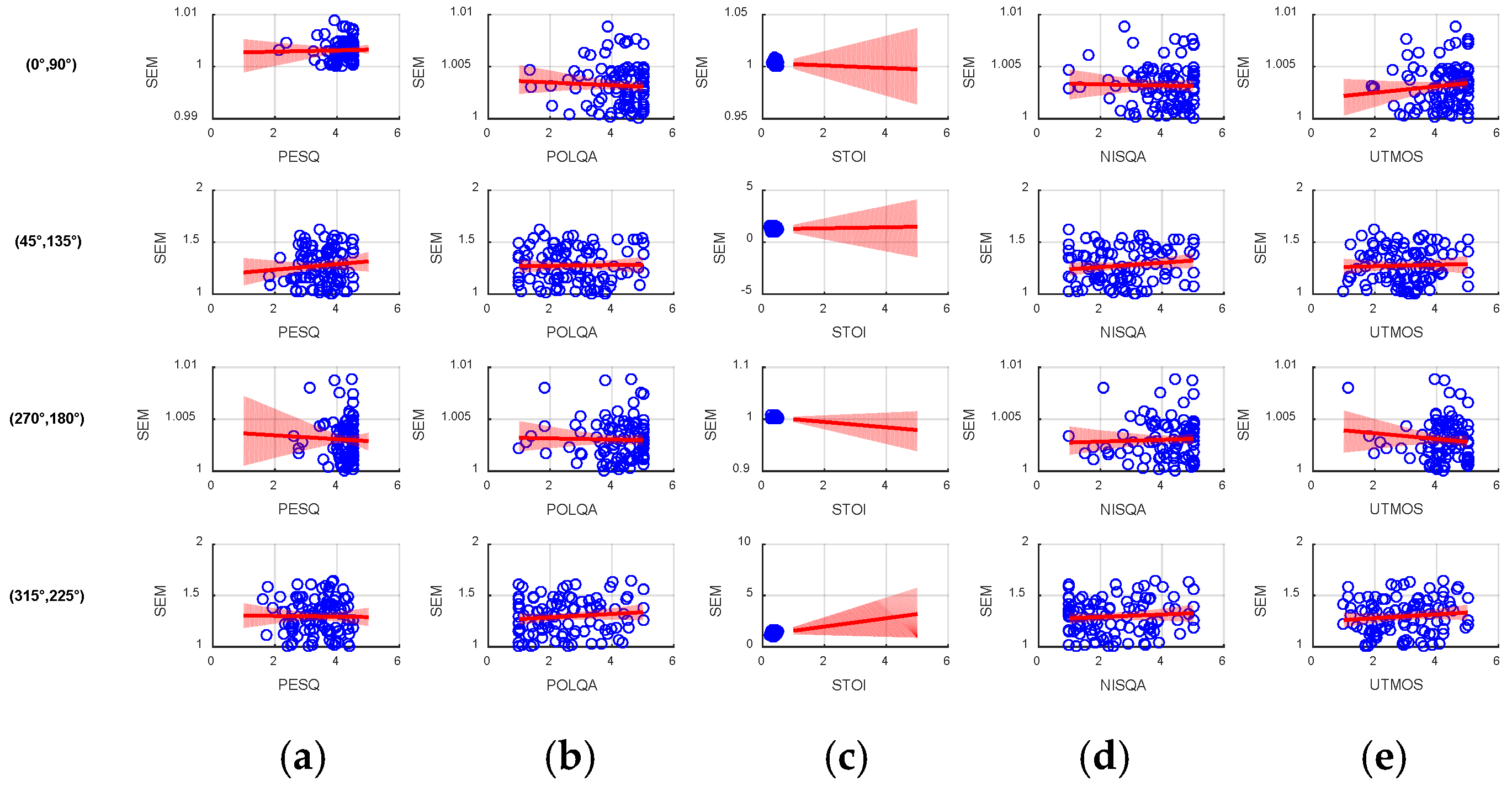 , PESQ, POLQA, STOI, NISQA and UTMOS are distributed across the four angular pairs, (0°, 90°), (45°, 135°), (270°, 180°), and (315°, 225°). A clear pattern emerges in these angular pairs. For the angular pairs (0°, 90°) and (270°, 180°),