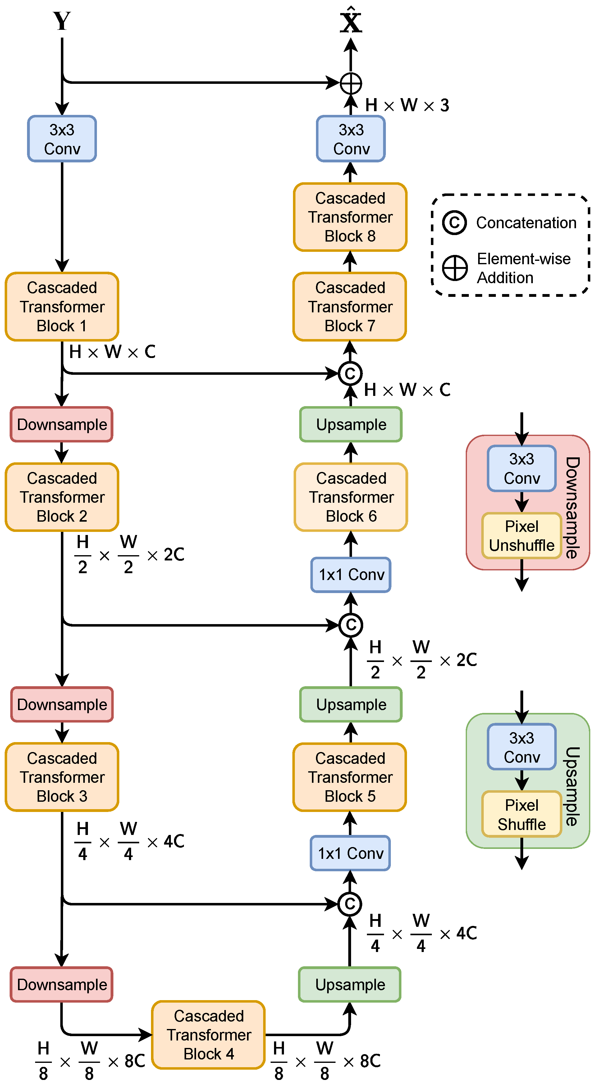 - Fan, C.M.; Liu, T.J.; Liu, K.H. SUNet: Swin transformer unet for image denoising. In IEEE International Symposium on Circuits and Systems, Austin, Texas, USA, 28 May–1 June 2022; IEEE: Piscataway, NJ, USA, 2022; pp. 2333–2337. [Google Scholar] [CrossRef]