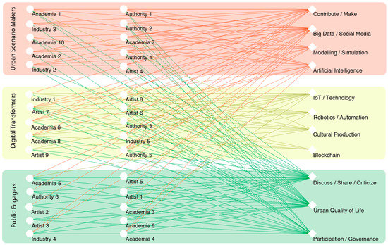 Very few artists are found in the “Urban Scenario Makers” cluster. As a result, there is little critical discussion about scenarios and visions (e.g., a strong prevailing techno-naïve attitude). The “Urban Scenario Makers” cluster have no links to “applied” technology in the digital transformation group. Their tools are data and simulation. In return, they do not engage with tangible technologies, yet.