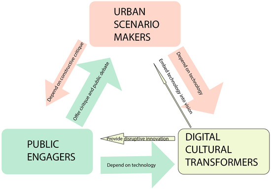 The Public Engagers focus on public debate and discussion. They lift themselves above the Digital Cultural Transformers as they often lack the tools and technology to actually transform and instead engage the public. Being critical and reactive, the Public Engagers shy away from developing scenarios, yet depend on those proposed by the Urban Scenario Makers.