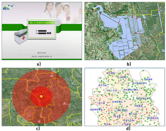 Health epidemic prevention and control system (a) System login; (b) Distribution of affected areas; (c) Analysis of epidemic buffer zone; (d) Insecticidal drugs allocation.