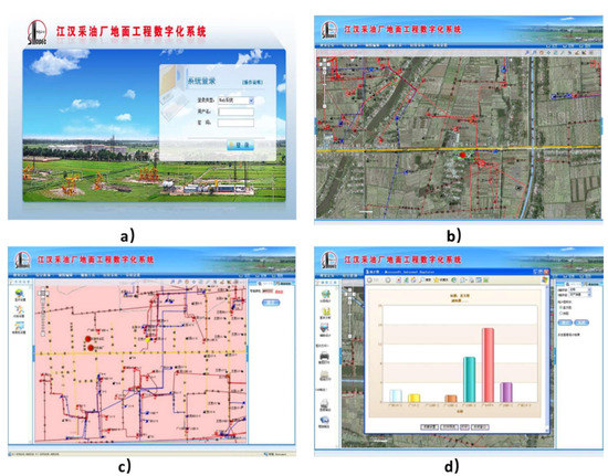 Jianghan Oil-Extracting Company (JOEC) is affiliated with Jianghan Oilfield, part of China’s state-owned Sinopec. DISS-GEOEC has played a critical role since its inception in improving JOEC’s operating efficiency, incident detection, and cost savings. DISS-GEOEC can visualize information on oil well/station locations, equipment and model parameters, dynamic and static data records, and construction and management schedule for new projects (Figure 5). JOEC has utilized DISS-GEOEC to monitor their well operations real-time; this real-time monitoring capability helps shorten troubleshooting times for oil wells and effectively improves the safety feature of the equipment. For instance, aided by DISS-GEOEC, the Wuqi operating area of JOEC discovered and handled more than 70 abnormal well stoppages and more than 90 process failures in 2009. In addition, DISS-GEOEC supported more than 20 times of pipe network overhaul and 5 times key station renovations; the total work time needed for the renovations was reduced to 10 days, which typically took two months in the past without DISS-GEOEC [30].