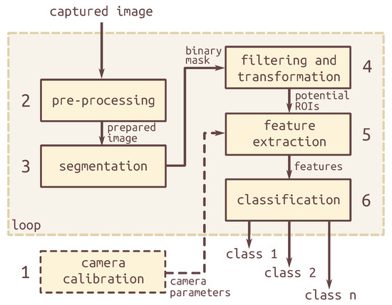 - Information about the camera, obtained during calibration, allows transforming initial ROI’s primary parameters into features estimated width, height and contour area which represent the object’s geometrical form in the real world (3D scene) independent of object distance and scene parameters. The detailed explanation of the stage feature extraction is provided in Section 4.